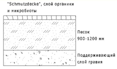 Жидкость проходит через слой мелкого песка с низкой скоростью (0,05-0,2 м/ч) под действием силы тяжести.