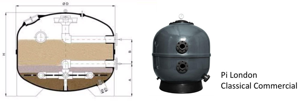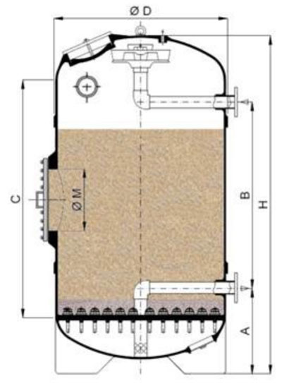 Вертикальные напорные фильтры, изготовленные по стандартам DIN с дюзовыми пластинами, обеспечивают максимальную эффективность фильтрации и обеспечивают наилучший результат, которого может достичь с любым фильтрующим материалом (кварцевый песок, AFM®, другой стеклянный наполнитель). Однако фильтры с хорошо спроектированной коллекторной системой распределения воды (расположенные близко друг к другу лучи/трубы коллектора и как можно ближе к стенкам фильтра) могут обеспечить фильтрацию, близкую к качеству фильтров с дюзовой пластиной.