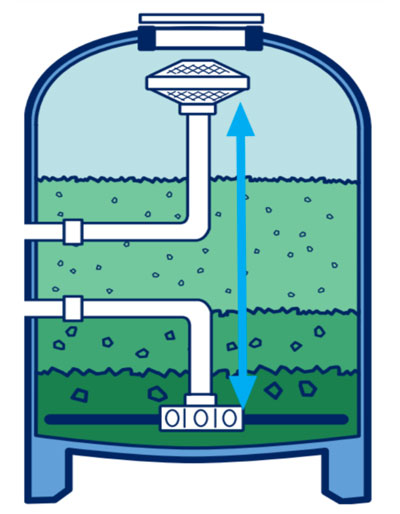 Под высокой загрузкой понимаются фильтры с высотой фильтрующей загрузки, как правило, 1000мм, 1200мм и 1500мм. Эти фильтры — очень хорошее решение для среднебюджетного проекта, если их можно промывать без воздуха. В отличие от фильтров с низкой загрузкой, здесь больше фильтрующий слой, а это означает лучшую фильтрацию. Чем больше сред придется пересечь частицам мусора, тем больше частиц задержит фильтр.