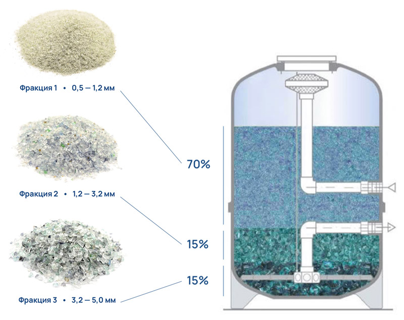 Поэтому для осветлительной фильтрации в бассейнах (а также для сорбционной фильтрации, в случае применения технологии обработки воды озоном), в основном, для фильтрующего слоя применяют всего несколько распространенных материалов: