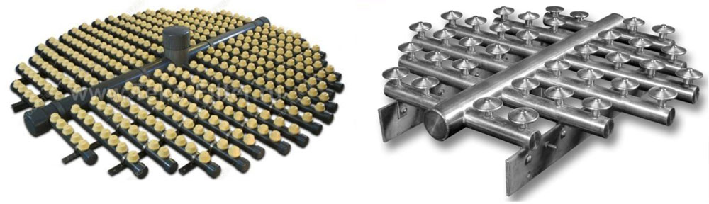 В этом случае делается конструкция нижнего коллектора с дюзами, сужающуюся в определенные точки системы распределения, чтобы создать равномерное перераспределение воды и воздуха. Эта конструкция испытана и работает в реальных установках.