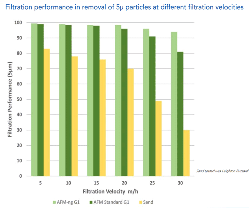 В качестве примера, если берется скорость потока воды 20 м/час, AFM® удаляет 95% всех частиц до 5 мкм по сравнению с высококачественным песком, удаляющим только 70% всех частиц размером до 5 мкм. В качестве песка использовался песок Лейтон Баззард из Англии, который является песком исключительно высокого качества. Другие виды песка, скорее всего, будут иметь более низкие эксплуатационные характеристики.