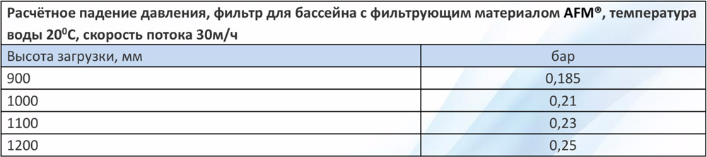 В таблице ниже показаны ориентировочные данные падения напора/давления на фильтрах с фильтрующим материалом AFM®: