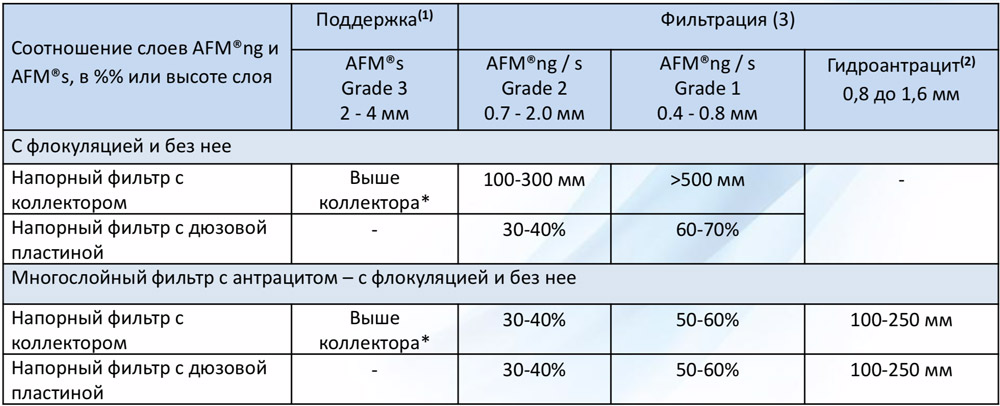 Варианты рекомендуемой высоты фракций при засыпке фильтров AFM®: